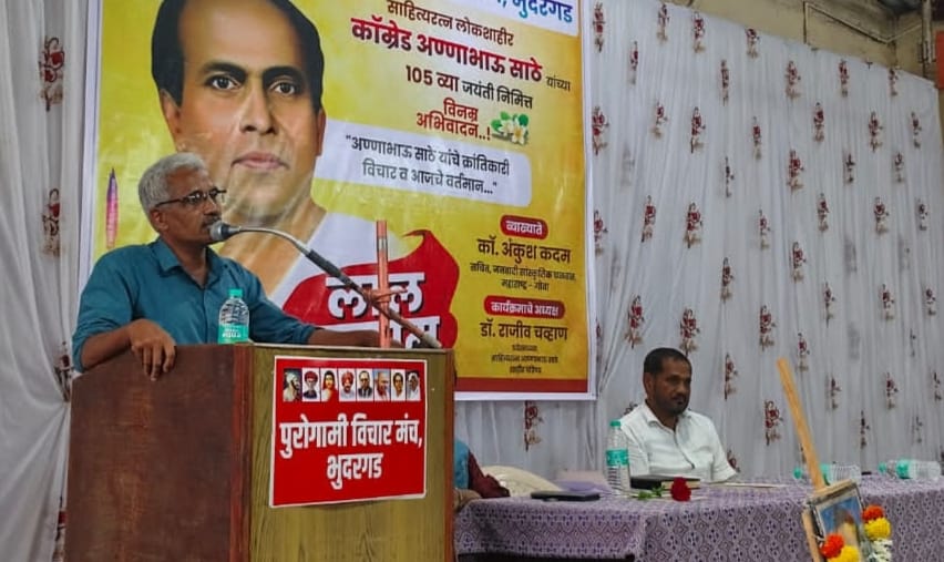समाज व्यवस्थेचे अचूक निरीक्षण करुन त्याला कागदावर प्रकट करुन समाजासमोर वाचा फोडणारे आण्णाभाऊ साठे महान कवी,कथाकार,कादंबरीकार,शाहिर होते.संयुक्त महाराष्ट्र चळवळीत आघाडीवर होते त्यामुळे चळवळीचे अग्रणी होते,असे प्रतिपादन जनवादी चळवळीचे सचिव कॉ. अंकुश कदम कणकवली यांनी केले. ते पुरोगामी विचार मंच आयोजित साहित्यरत्न आण्णा भाऊ साठे जयंती प्रसंगी शाहू वाचनालय येथे बोलत होते. कार्यक्रमाच्या अध्यक्षस्थानी शाहीर परिषदेचे अध्यक्ष डॉ. राजीव चव्हाण होते. आण्णा भाऊ साठे विचार मंचच्या वतीनेही अभिवादन करण्यात आले.प्रतिमा पूजन गारगोटीचे सरपंच प्रकाश वास्कर यांच्या हस्ते करण्यात आले.यावेळी कॉ.संपत देसाई,कॉ.सम्राट मोरे,मश्चिंद्र मुगडे,राजेंद्र यादव शिवाजी जाधव,आदिनाथ मोरे,प्रदीप थडके,विलास वायदंडे,अशोक साठे, सुभाष कांबळे,राजू मोरे,उपस्थित होते.स्वागत सचिन भादिंगरे, प्रास्ताविक कृष्णा भारतीय यांनी केले.तर आभार मानसिंग देसाई यांनी मानले.